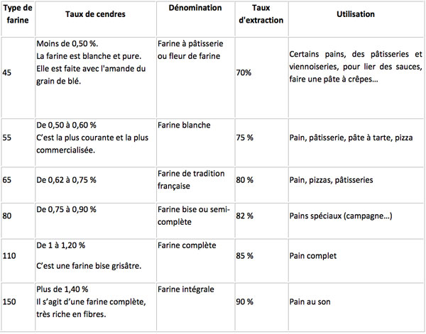 • Le type de farine : il correspond à un certain taux d’extraction et de taux de cendres. On recense 6 types, définis par un chiffre.