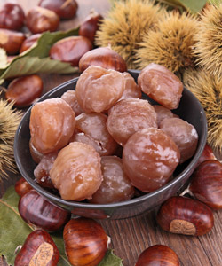 Si les châtaignes se ramassent en automne, les marrons glacés sont quant à eux consommés et disponibles, presque uniquement à Noël. Ils restent encore presque un produit de luxe. Ces confiseries premium sont composées d’un marron confit dans du sirop de sucre puis enrobé de sucre glace (« glacé » donc). Plusieurs jours sont nécessaires à leur fabrication.
