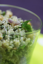 - 5- Dans un grand saladier, mélangez le quinoa avec les pois chiches, les lentilles germées, l’oignon émincé, la menthe et la coriandre finement ciselées et les raisins secs.