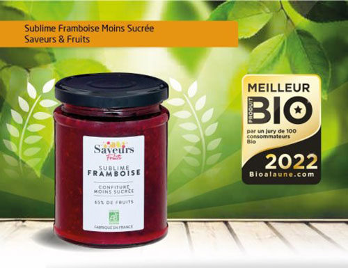 Cette confiture de framboise moins sucrée, a reçu un franc succès grâce à la saveur authentique de ce petit fruit rouge, à la fois doux et acidulé. Elle contient 65 % de fruits et -33 % de sucre comparé à une confiture classique, elle est fabriquée en France et certifiée agriculture biologique.