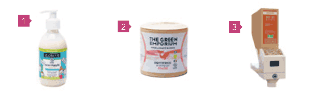 1. Distributeur de recharges à diluer pour l’hygiène et la brillance de la salle de bains, par Etamine du Lys, stand I11.