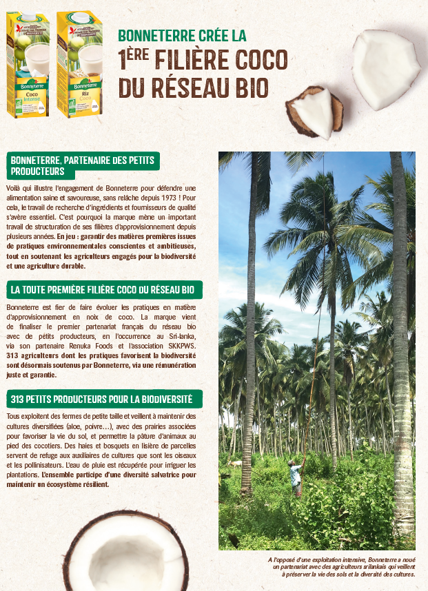 Leader sur les boissons végétales, Bonneterre propose aux gourmands sensibles aux enjeux environnementaux d’adopter un nouvel éco-geste : ajouter soi-même la quantité d’eau souhaitée à ses boissons végétales préférées pour réduire son impact carbone**. Un petit geste pour participer aux grands défis. En parallèle, la marque met en place la 1ère filière coco du réseau bio : pour participer à préserver un écosystème résilient et à garantir une utilisation durable des sols, au profit de la biodiversité et des agriculteurs.