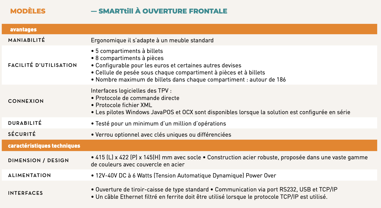 - Nul besoin d’investir dans un nouveau mobilier, ses dimensions et son encombrement sont similaires à un tiroir- caisse traditionnel. Il s’intègre donc naturellement dans tous les meubles de caisse à ouverture verticale.