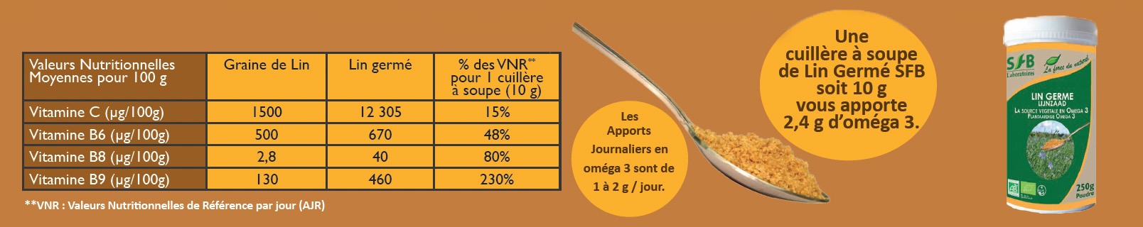 1 cuillère à soupe (10 g) vous apportent 2,4 g d’oméga 3 ainsi que 15% des VNR en Vit. C, 48% en Vit. B6, 80% en Vit. B8 et 230% en Vit. B9.