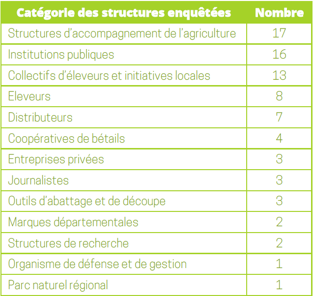 Analyse des entretiens en fonction des pratiques des acteurs : Les entretiens ont été analysés selon 8 domaines de pratiques jugés structurant dans les stratégies des acteurs envers la viande bio : le circuit d’approvisionnement, de commercialisation, la destination des produits, le mode de valorisation, la stratégie de communication, l’importance accordée au classement de la carcasse, la race et l’autonomie alimentaire.