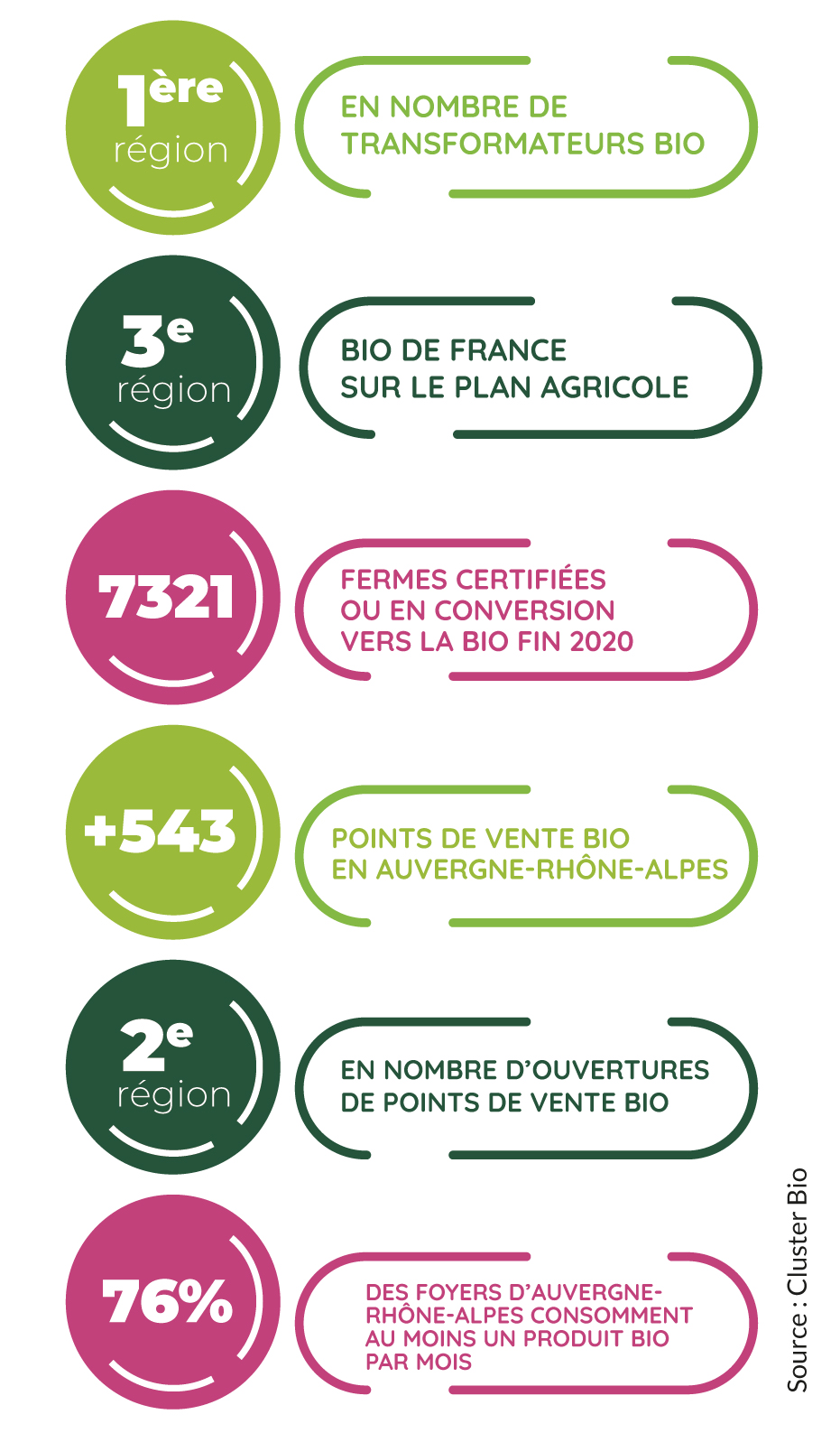 En 2021, la Chambre Régionale d’Agriculture Auvergne Rhône Alpes a accompagné plus de 6 000 agriculteurs dans leur conversion vers la bio et, sur les 6 derniers mois de l’année, le territoire a accueilli les 2/3 des nouveaux magasins bio ouverts en France !
