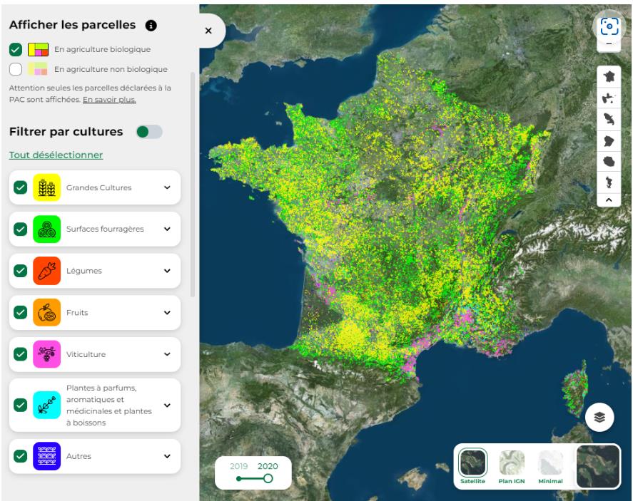 Outil interactif et libre d’accès, CartoBio permet de visualiser les parcelles agricoles bio françaises avec les surfaces, les cultures conduites et leur historique. Ces données anonymisées, sans mention des personnes physique ou morale, sont dorénavant à disposition des citoyens, des élus et des administrations oeuvrant à l’adaptation des politiques agricoles locales sans oublier les chercheurs réalisant des études sur l’impact du bio sur la santé, l’environnement…
