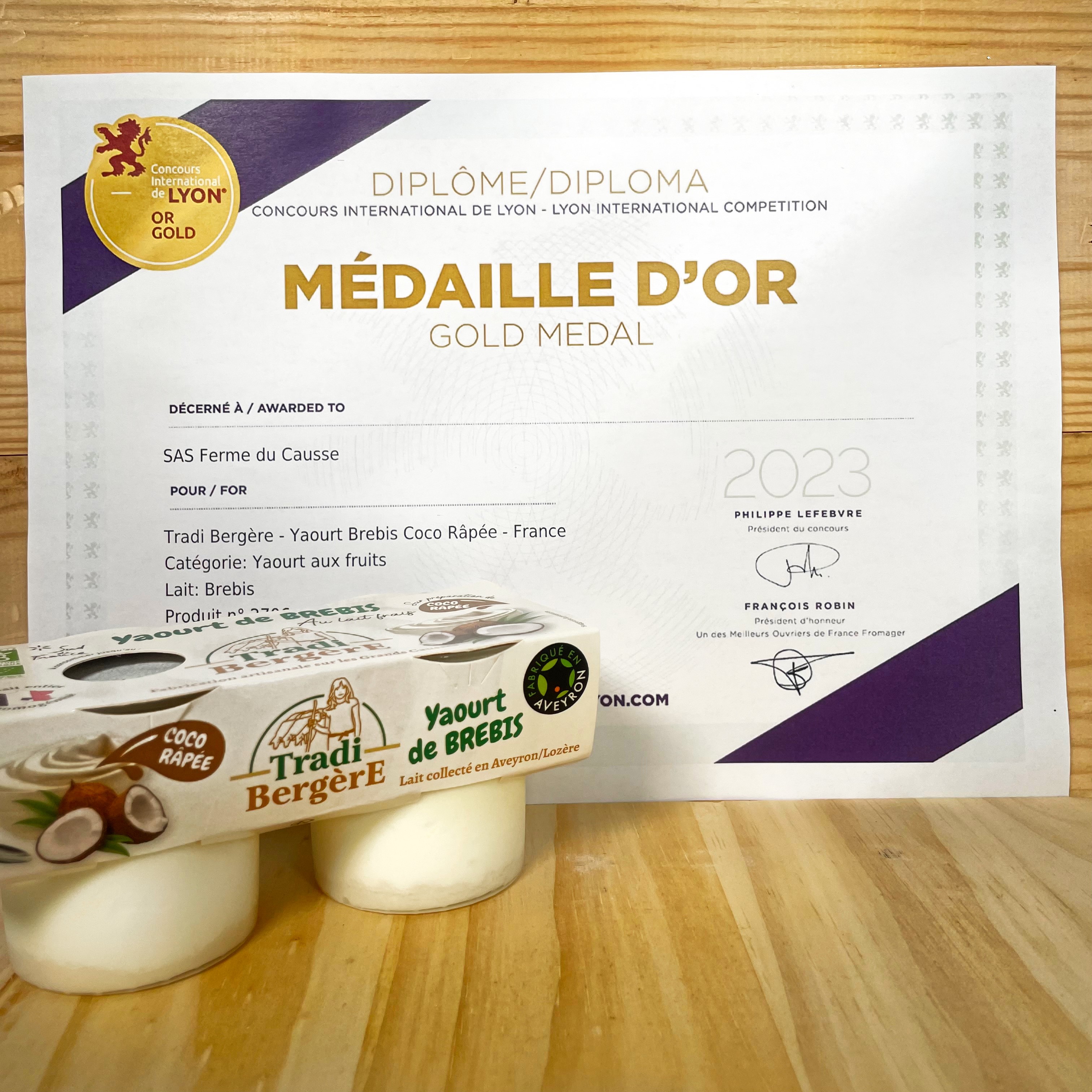Nous sommes fiers de vous annoncer que notre yaourt coco râpée Tradi-bergère à remporté la médaille d’or au Concours International de Lyon 2023.