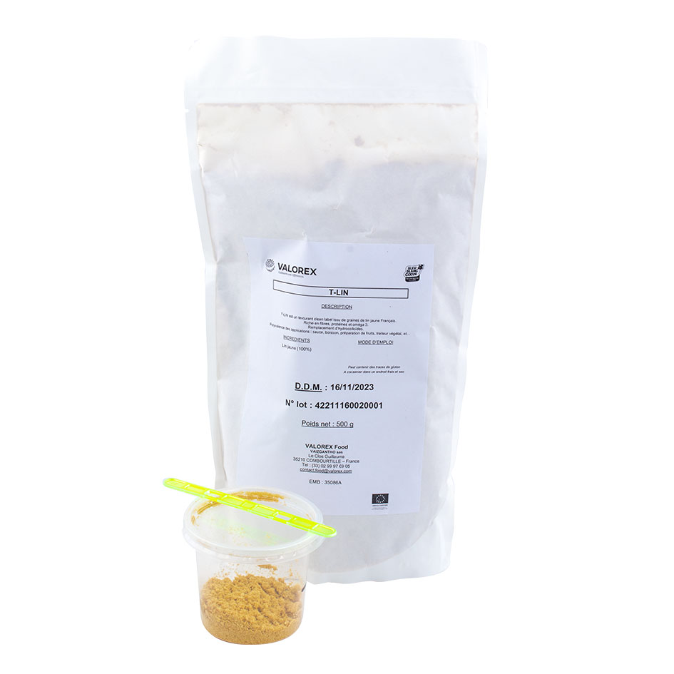 Il s’agit d’une solution de substitution des oeufs en boulangerie-pâtisserie. Cet ingrédient clean-label est composé à 100% de farine de lin bio, sans gluten et d’origine France. Il permet de substituer totalement ou partiellement les oeufs dans les préparations. Le T-lin sécurise le sourcing, offre un gain économique, convient aux régimes vegan et possède des propriétés texturantes et émulsifiantes.