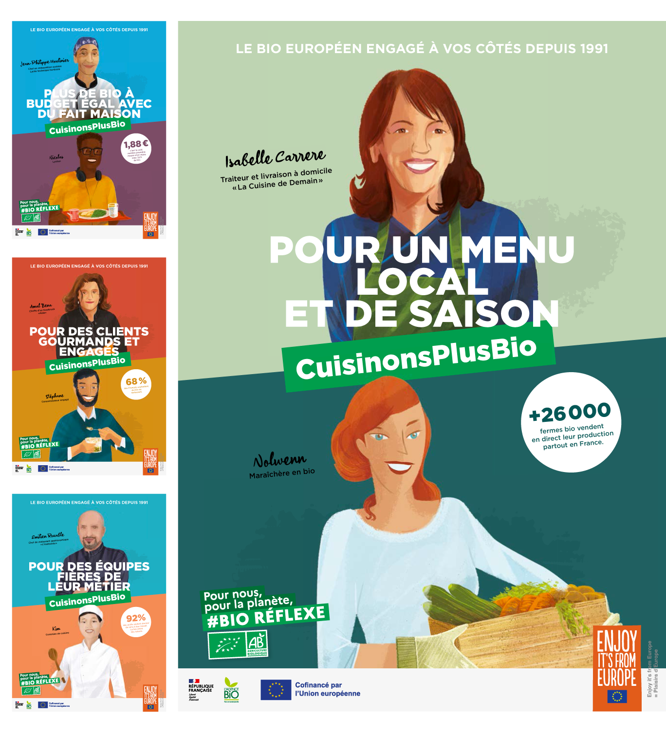 Accompagnée par l’agence de communication GS&CO (Gulfstream Group), cette campagne co-financée par l’Europe pendant 3 ans a été révélée dans son intégralité lundi 11 septembre 2023 au SIRHA OMNIVORE PARIS. Avec notamment, la présentation des 4 affiches de campagne et du pool des 13 chef.fe.s ambassadeurs. drices par région, sélectionné.e.s par l’Agence BIO pour leurs bonnes pratiques et leur enthousiasme à témoigner collectivement des bénéfices qu’ils observent en faisant le choix de proposer des menus à base de produits issus de l’agriculture biologique au sein de leurs établissements.