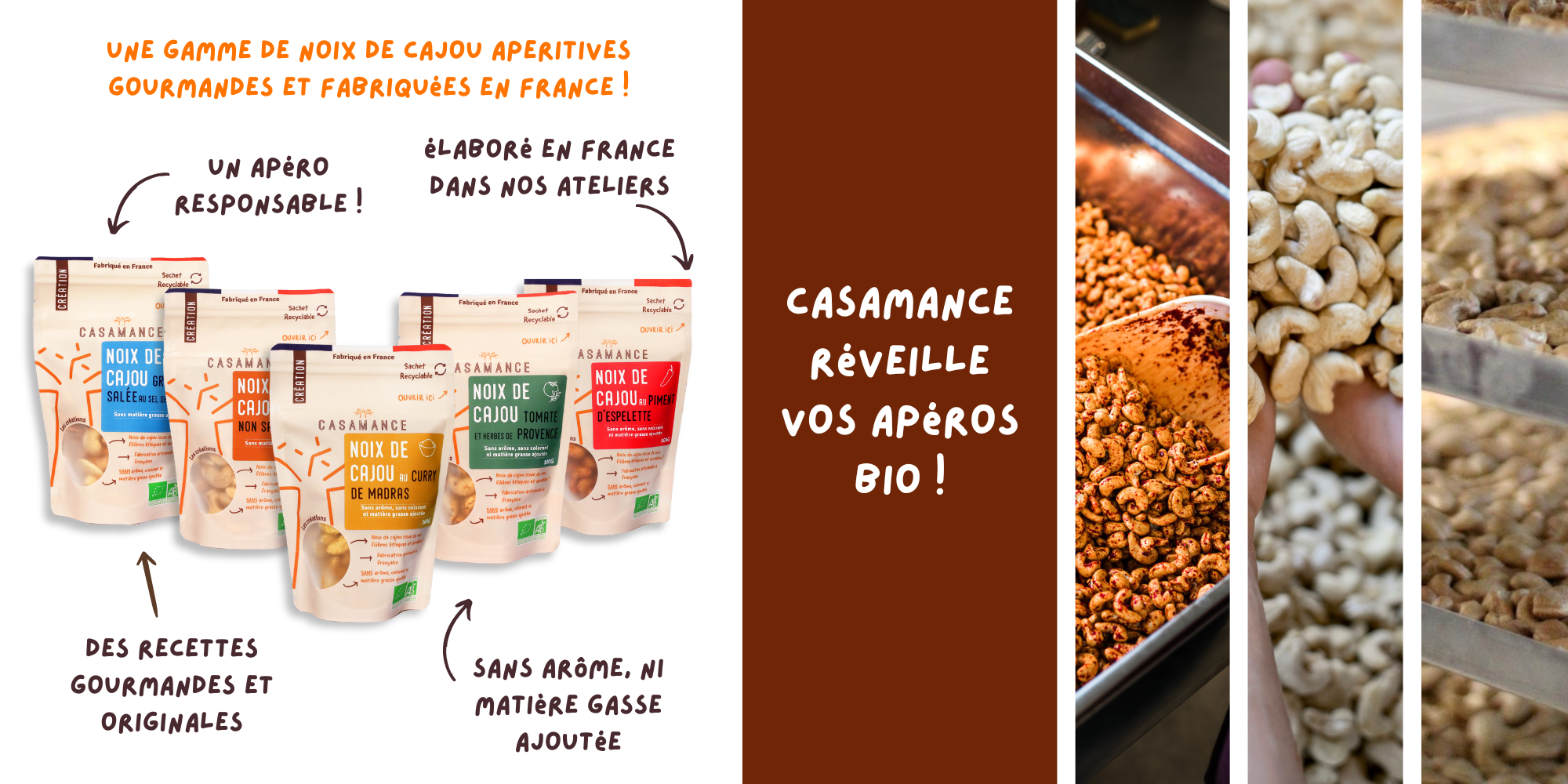 La gamme CREATION, une large gamme de noix de cajou salée ou sucrée à déguster à l’apéritif, en encas pour une pause gourmande ou bien pour agrémenter un plat cuisiné ! Chaque recette est concoctée par Casamance et fabriquée dans leur atelier artisanal à Hossegor dans les Landes. Leur savoir faire allié à de bons ingrédients vous assure un plaisir inégalé à la dégustation.