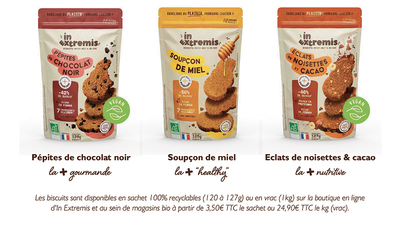 Se régaler avec des biscuits moins sucrés, riches en fibres et sources en protéines, c’est possible ! Depuis 2020, In Extremis s’est donnée la mission de démocratiser l’alimentation saine et durable en luttant contre la « malbouffe » et le gaspillage alimentaire.