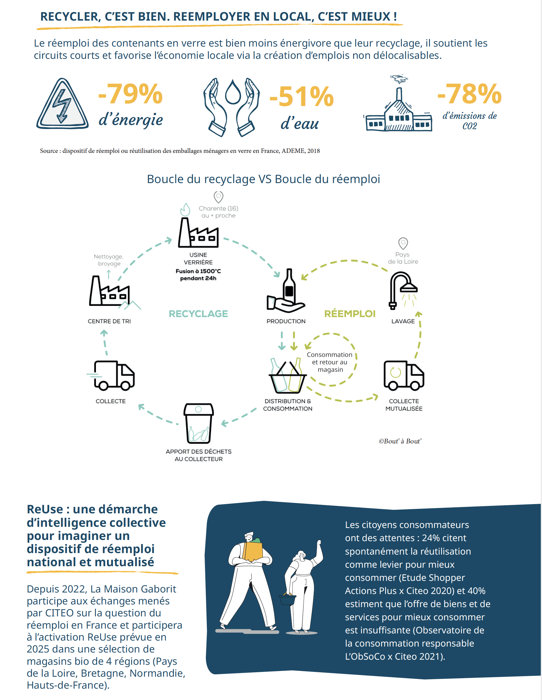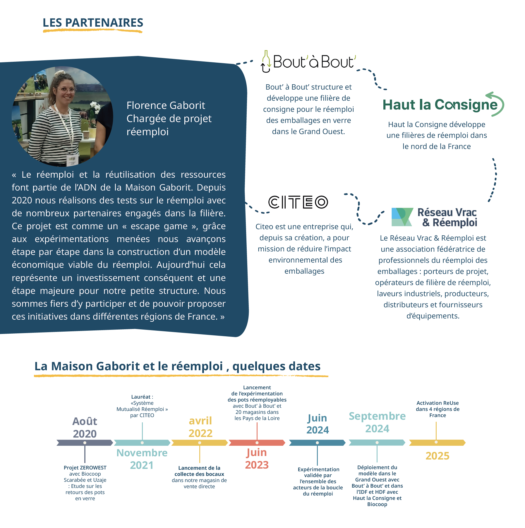 « A la Maison Gaborit, nous recyclons le petit-lait des fromages et nous réutilisons l’eau de la laiterie pour la ferme. Se lancer dans le réemploi de nos pots en verre était donc naturel. Après deux années de tests infructueux, de réflexions et de succès encourageants, nous sommes vraiment heureux de valider l’expérimentation opérationnelle menée dans les Pays de la Loire. Nous sommes en phase de collecte et massification des bocaux, et projetons un réemploi sur nos lignes de conditionnement au premier trimestre 2025. Nos pots verre 400g réemployables sont disponibles dans toute la France pour les opérateurs locaux des filières du réemploi afin d’enclencher chez d’autres producteurs la réutilisation de ces bocaux. » Hélène Gaborit, co-gérante