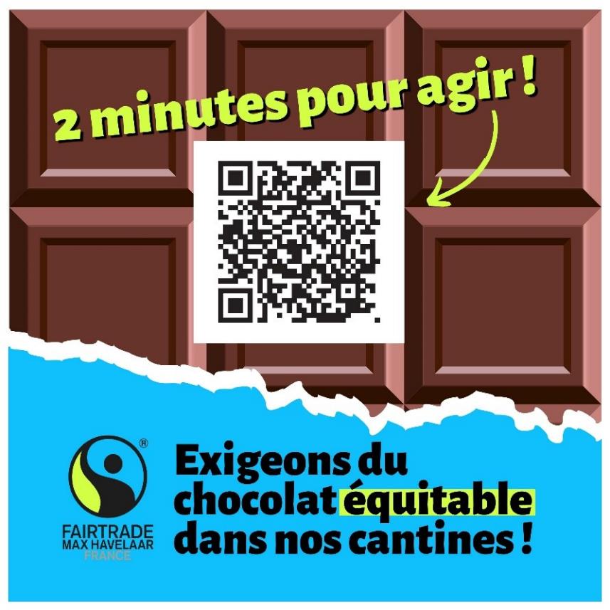 Les citoyens, grâce à leur smartphone peuvent directement interpeller leurs élus locaux en demandant l’utilisation de chocolat équitable dans les cantines de leurs collectivités respectives. Il suffit de suivre le QR Code ci-dessous pour interpeller les élus.