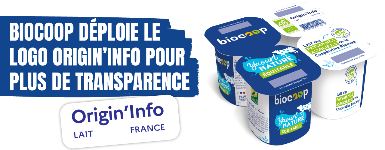 Biocoop intègre déjà, depuis 2020, l’origine des matières premières principales et le lieu de fabrication du produit en face avant, ainsi que l’adresse du fabricant au dos. Désormais, sur le nouveau yaourt nature, le logo Origin’Info et la mention « Lait France » sont apposés sur l’opercule.