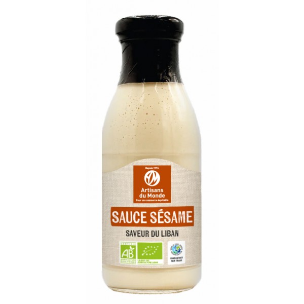 Sauce sésame bio et équitable du Liban ARTISANS DU MONDE - SOLIDAR’MONDE Une sauce artisanale élaborée à partir d’ingrédients biologiques, issus du commerce équitable. Prête à l’emploi, elle est fabriquée par une coopérative de femmes qui perpétue le savoir-faire culinaire levantin tout en l’inscrivant dans une démarche de modernité et d’innovation. Avec son goût à la fois riche, authentique et engagé, elle se distingue comme une première sur le marché équitable et dans les réseaux spécialisés bio, offrant aux consommateurs une expérience gustative unique et responsable.