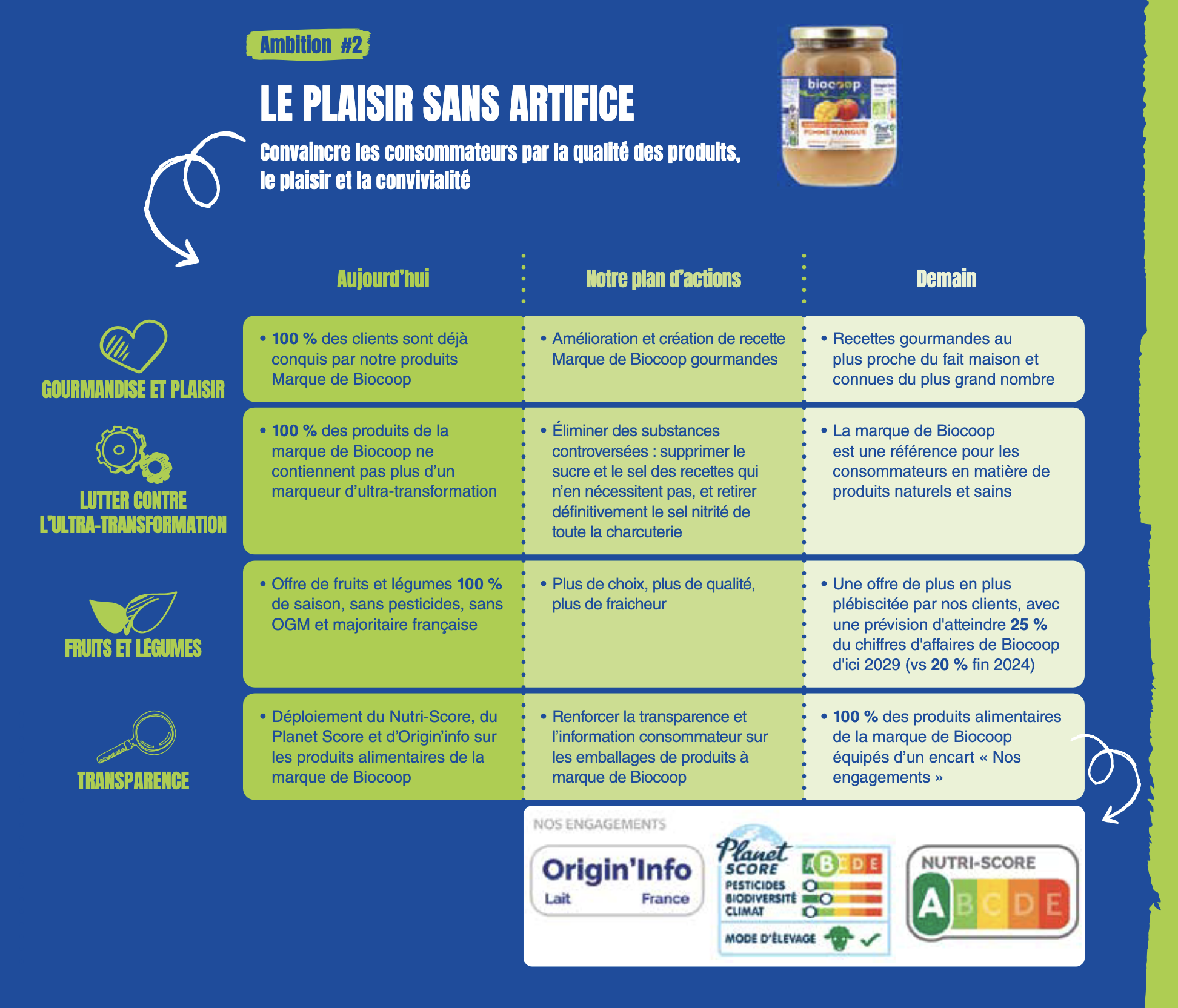 "Biocoop, leader de la distribution bio spécialisée, incarne depuis près de 40 ans une autre manière de faire du commerce, fondée sur un modèle unique, coopératif, commerçant et militant. Sa mission n’a jamais changé : développer l’agriculture biologique dans le respect des Hommes et de la planète. Après plusieurs années marquées par un repli du marché, l’année 2025 apparaît comme un moment de bascule : d’un côté, les consommateurs expriment de plus en plus clairement leur aspiration à une alimentation plus responsable ; de l’autre, les pouvoirs publics reculent sur leurs engagements en matière de transition agricole, alimentaire et écologique. Face à ces défis, les sociétaires Biocoop ont pleinement pris conscience de la nécessité d’accélérer et de s’adapter à cet environnement complexe pour préserver et faire vivre la bio. C’est pourquoi, après plusieurs mois de co‑construction, ils ont voté fin juin 2025 la nouvelle « Stratégie 2029 » de la coopérative avec des moyens historiques de plusieurs dizaines de millions d'euros pour son déploiement : des ambitions claires et chiffrées pour préciser la trajectoire et le positionnement que Biocoop souhaite atteindre à cet horizon. Cette stratégie doit permettre de renforcer notre positionnement de leader de la bio engagée en France, tout en restant fidèle à nos combats fondateurs. PLUS ACCESSIBLE PLUS GOURMAND PLUS MILITANT."