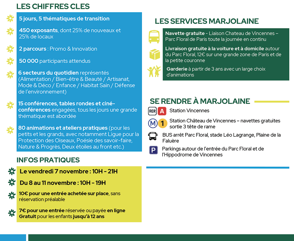 Il est nécessaire de positiver selon Ondine Prouvost, la directrice du salon. “Il faut éviter de sombrer dans la morosité ambiante. Marjolaine est et restera ce lieu d’échanges entre les consommateurs et les acteurs de la consommation éthique et responsable. 5 journées thématiques permettront un échange apaisé et positif pour continuer à changer le monde et la société à travers une infinité d’actions et de savoir-faire que Marjolaine fait découvrir au plus grand nombre.”