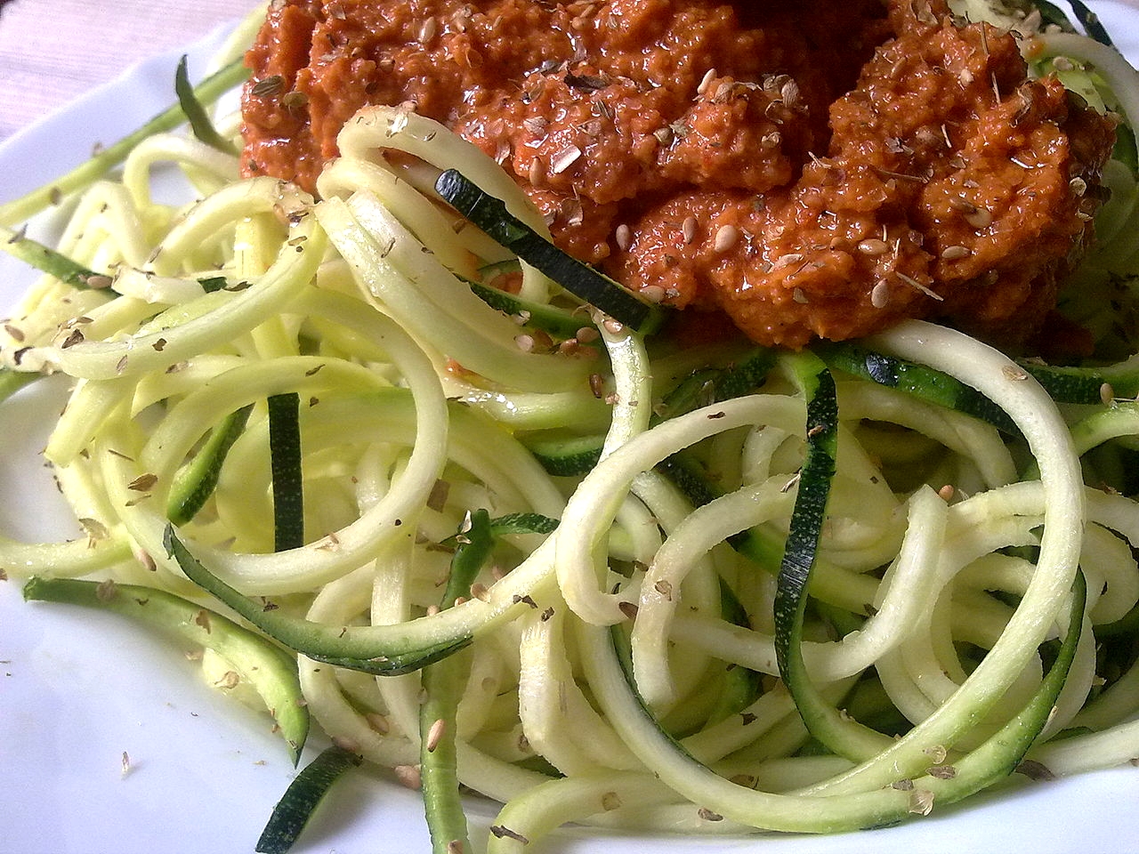 | Manger cru n’est pas exceptionnel : nous le faisons déjà avec les légumes mangés frais et/ou en salade, avec des viandes comme les steaks tartares, les carpaccios, certaines viandes et charcuteries séchées ou fumées, les poissons également séchés ou fumés, mais aussi crus (sashimis). En raw food, outre les aliments cités à l’instant, la palette des aliments est de fait très vaste : aliments fermentés (choucroute, navets, betteraves rouges…), huiles végétales pressées à froid, vinaigre, miel, produits laitiers non cuits et surtout non pasteurisés, champignons et graines, œuf cru, graines germées, etc. Même des aliments qui sont habituellement cuits peuvent être consommés crus, comme le riz si on le laisse gonfler plusieurs heures dans l’eau. | ![]() Plat de spaghettis de légumes raw et vegan avec de la saucisse végétale (Photo Wikimedia Commons Lablascovegmenu). |