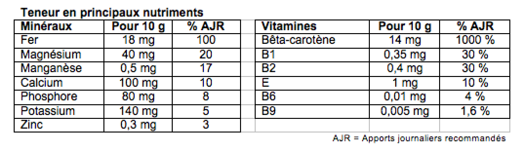 Dans la pratique, la spiruline ne contient aucun micronutriment qui ne soit pas apporté par l’alimentation courante. Néanmoins, si on se réfère au tableau ci-dessus, avec une prise quotidienne effective de 10 g de spiruline (une vingtaine de comprimés ou gélules dosés à 500 mg quand même), c’est pour le bêta-carotène, le fer, les vitamines B1 et B2, le magnésium voire le manganèse, que cette spiruline est vraiment intéressante. Mais dans ce cas, plutôt que prendre ces 20 comprimés et gélules, il vaut sans doute mieux la consommer sous forme de poudre, ajoutée à d’autres aliments (idéalement sans chauffage ni cuisson par contre, pour préserver la teneur en nutriments).