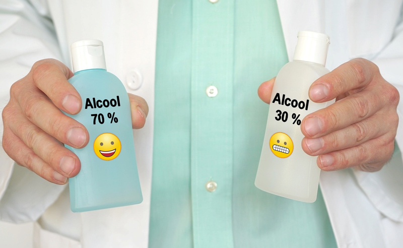 Cet éthanol (alias alcool éthylique, mais aussi l’alcool isopropylique ou isopropanol, obtenu par synthèse), est actif sur les bactéries, y compris sur les très résistantes mycobactéries (comme le bacille de Koch, le microbe responsable de la tuberculose) et sur les champignons (l’action fongicide de l’alcool est très importante). Il est également efficace sur de nombreux virus dits « enveloppés », comme ceux du SIDA (HIV), de l’herpès, de la rage ou du Covid-19, le fameux Sars-CoV-2. Seule exception, les virus dits « nus », c’est-à-dire sans enveloppe, comme celui de l’hépatite A ou de la polio.